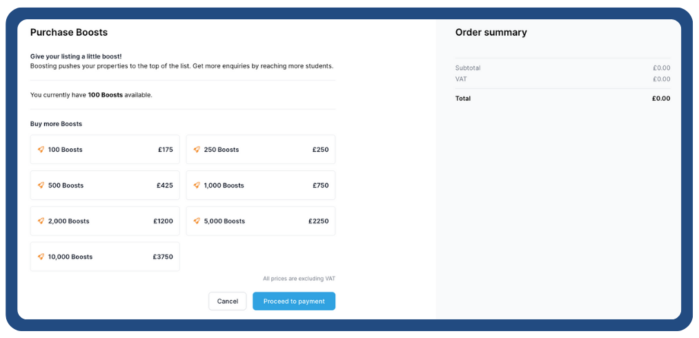 By boosting a property, you increase the chances of students clicking on your listing, and therefore boost the chance of receiving enquiries.
