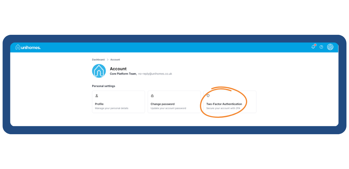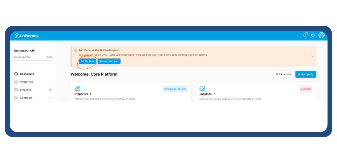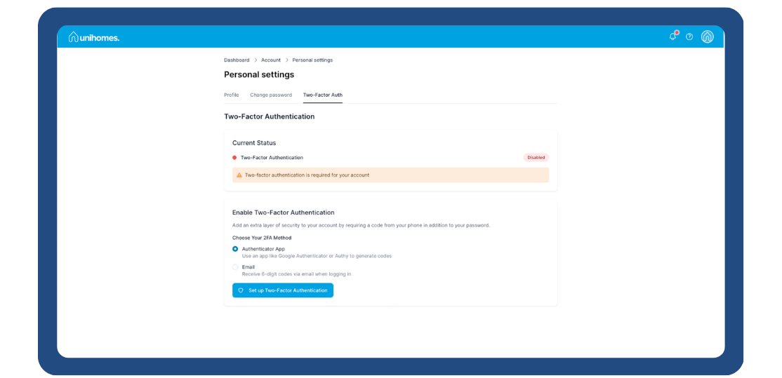 If you click the Set Up Now button, you’ll be taken directly to the setup page. You can dismiss the prompt for a short period if you wish. If the prompt is dismissed, but you would like to set up 2FA, you can visit https://agents.unihomes.co.uk/account and select Two-Factor Authentication option in there: