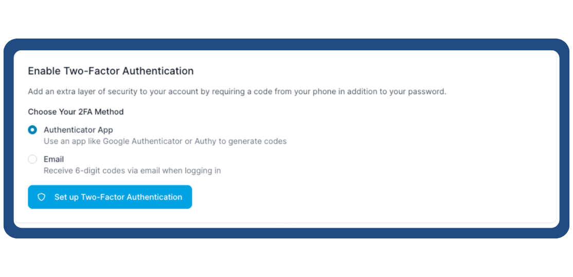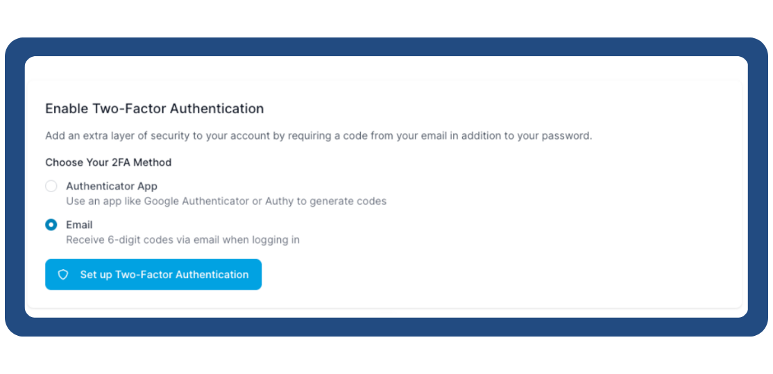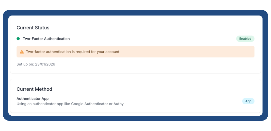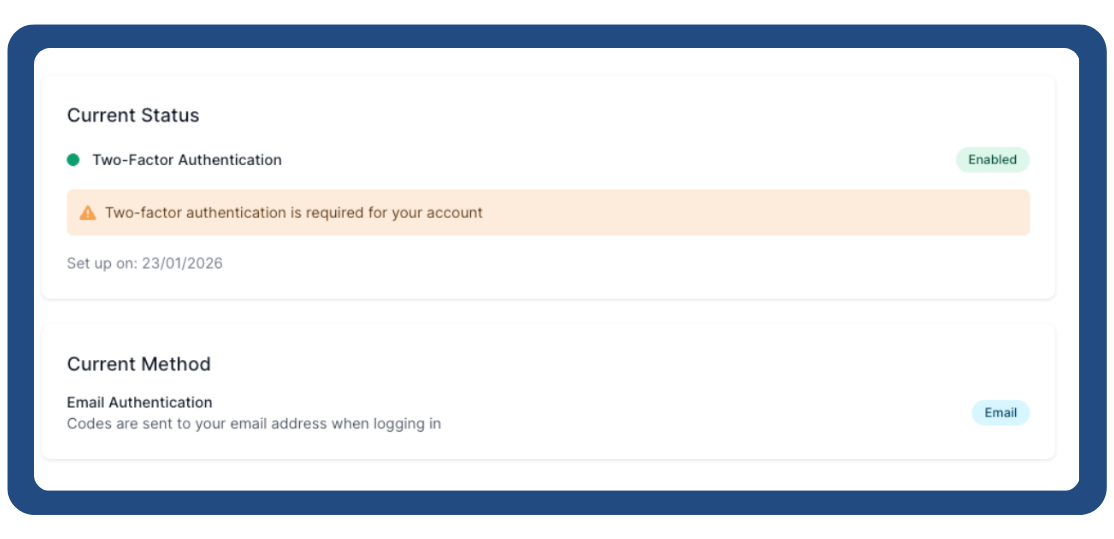 We have two methods available for you to use. We would strongly recommend you utilise the Authenticator App version of 2FA as it keeps your account the most secure. You can only have one method active for your account at any time. You will need to reach out to your account manager if in the future you wish to change the method you use.