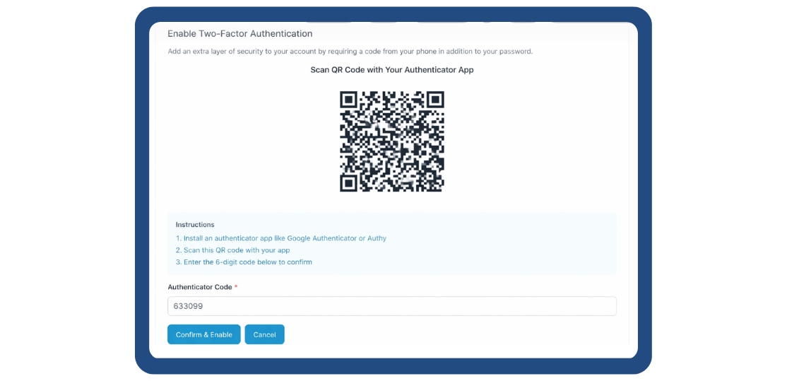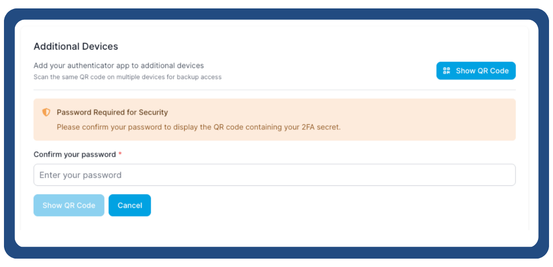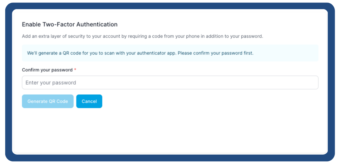 Once you enter your password, please click the Generate QR Code button. The system will then return your unique QR code which you can scan using an app like Google Authenticator or Authy.