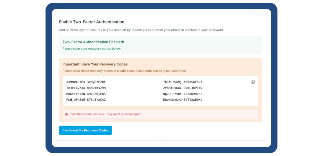 Once you’ve saved these codes, you can click the ‘ I’ve Saved My Recovery Codes’ button to continue.