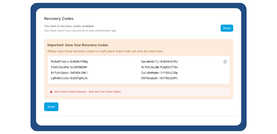 You can click the copy icon on the top right to copy the codes to your clipboard. It’s really important that you paste these to somewhere secure. If you lose your device, you’ll be able to use these codes a maximum of once each to log back into the agent portal.