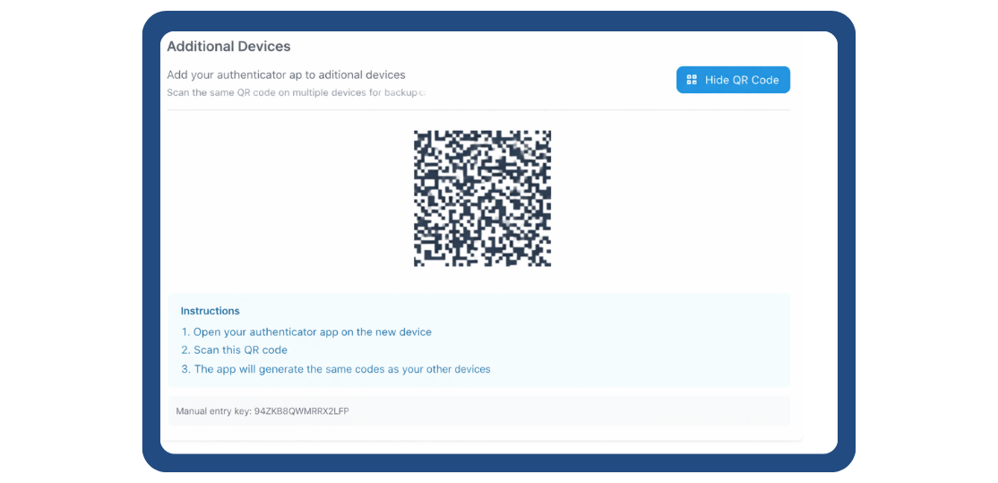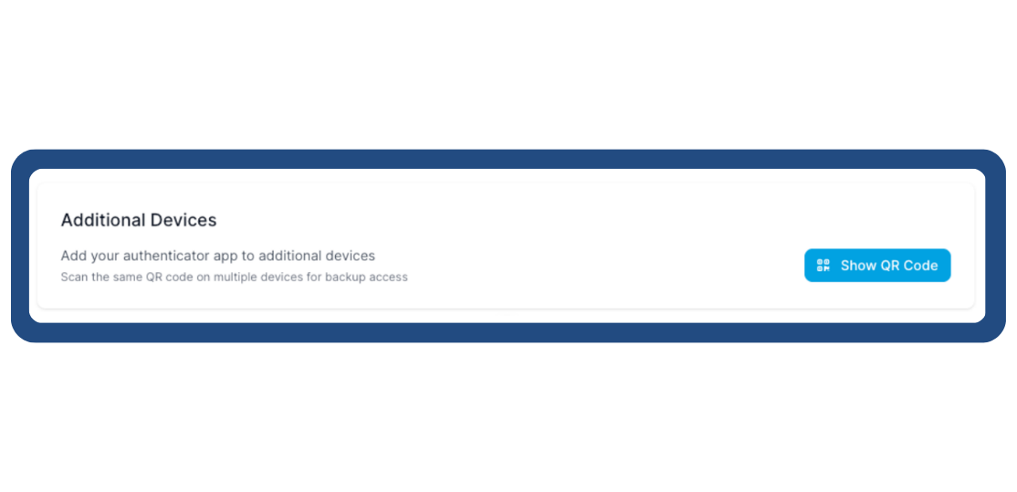 If you lose the original device you were authenticating with, or you would like to add an additional device, you can click the Show QR Code button to show your QR code again.
