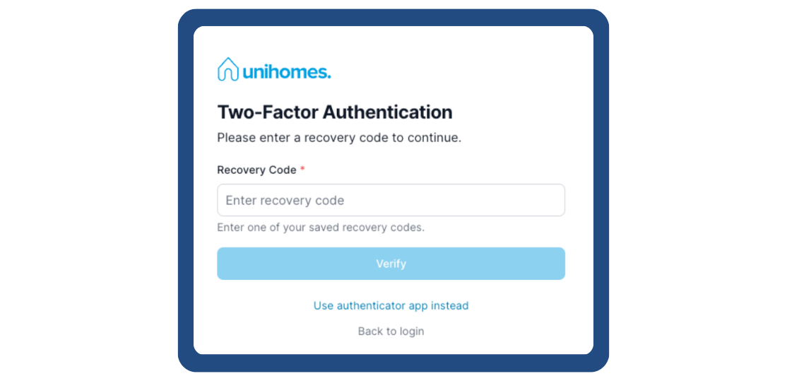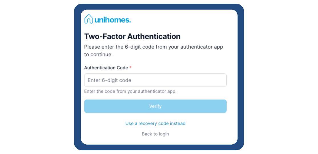 Log in as you normally do at https://agents.unihomes.co.uk/ and you’ll be presented with the form to input your six digit code from your app: