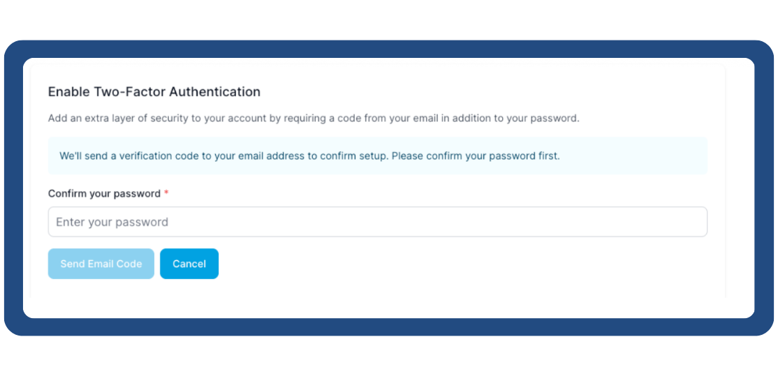 With the Email selected, click the Set up Two-Factor Authentication button. For security purposes, we’ll ask you to re-enter your password.