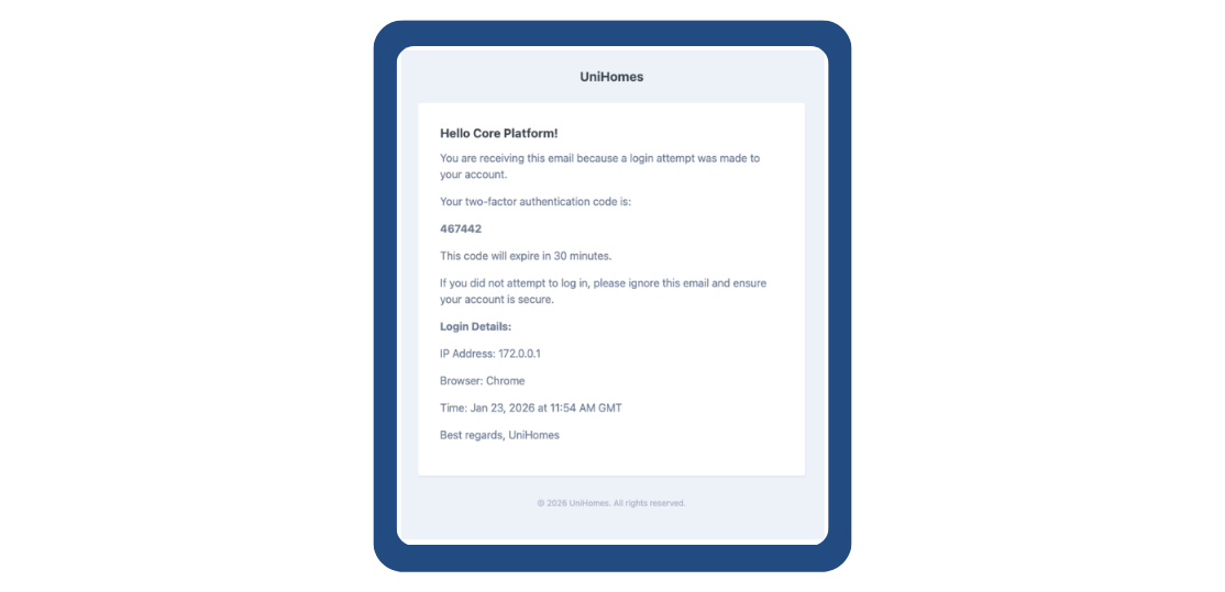 no-reply@unihomes.co.uk on your email account. You can click the Didn’t receive the code? Resend a maximum of three times in thirty minutes.