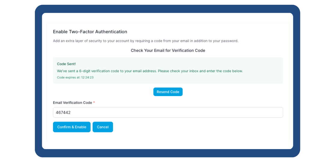 Enter the six-digit code the app is giving you on the screen and click Confirm & Enable: