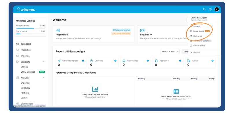 - Log in to your Agent Portal and click on your profile icon (top right) and select “Spare rooms” from the dropdown menu.